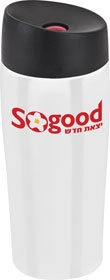 כוס טרמית עשויה מנירוסטה מבחוץ ופלסטיק מבחוץ עם פיה וכתור לחיץ לסגירה בטוחה ושימוש נח.